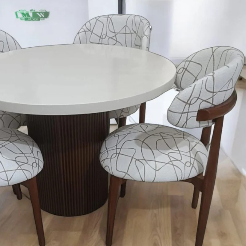 استمتع بتجربة تناول الطعام بأسلوب راقٍ مع ترابيزة السفرة الدائرية المصنوعة من خشب الزان الروماني. تصميمها الأنيق وتشطيبها عالي الجودة يجعلها خيارًا مثاليًا لديكور منزلك. الكراسي المصاحبة بتصميم الهلال توفر مزيجًا من الراحة والجمال.
